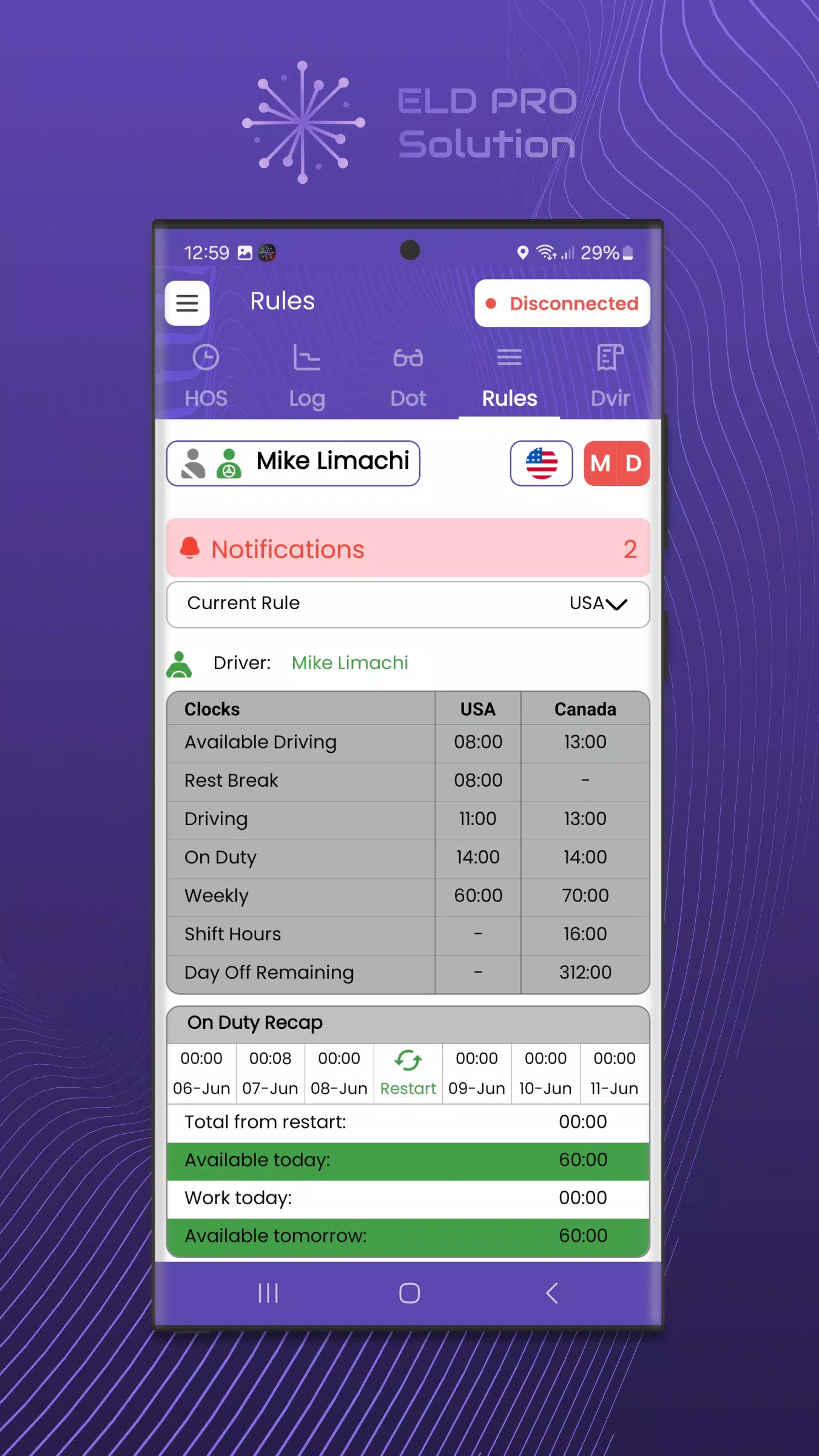 - Multiple Working Statuses: Drivers can switch between different working statuses such as Driving, On Duty, Off Duty, and Sleeping Berth with just a few taps on the app.